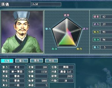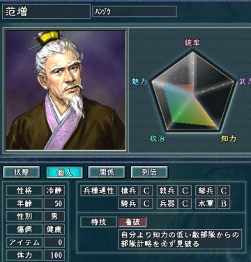 彼は、どうも、戦闘はダメそうですね。政治の補佐役といった感じですね。忠爺の弟子にしましょう。これで委任しても裏切らないでしょう。