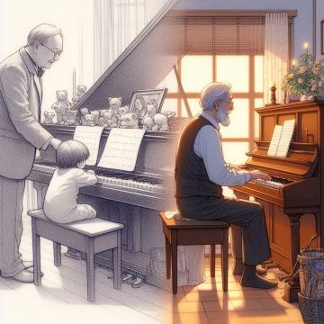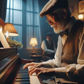 おじさんがピアノの弾き語りをしている風景